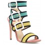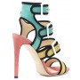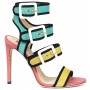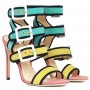 Sandalo in camoscio multicolor con tacco a spillo e fibbie e profili a contrasto.